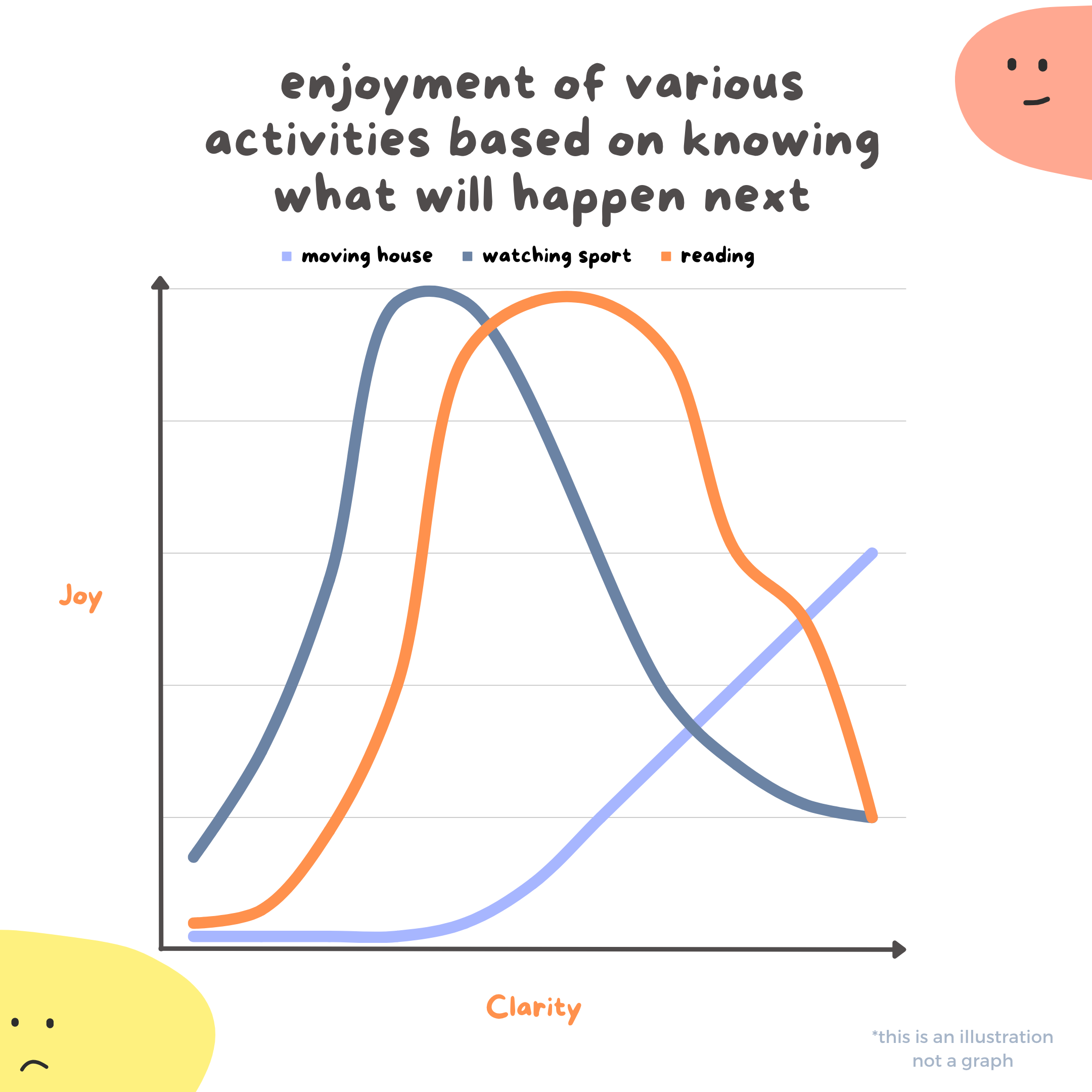 Reflecting on this, I sketched a “graph”. Essentially it’s suggesting that depending on the activity, our enjoyment is mediated by how much we know what is going to happen next (which I have labelled ‘Clarity’). There is a certain amount information you need (the threshold of sense I mentioned in the last letter), a narrowing of possibilities which enables enjoyment (e.g. understanding the rules of a sport, being able to understand a character’s motivations in a novel). But there is a point at which you can know “too much” (most blowouts in sports are uncompelling, there is an evaporation of tension when it becomes obvious the protagonist in a story won’t lose anything meaningful, that feeling of sadness when a thing is finished).